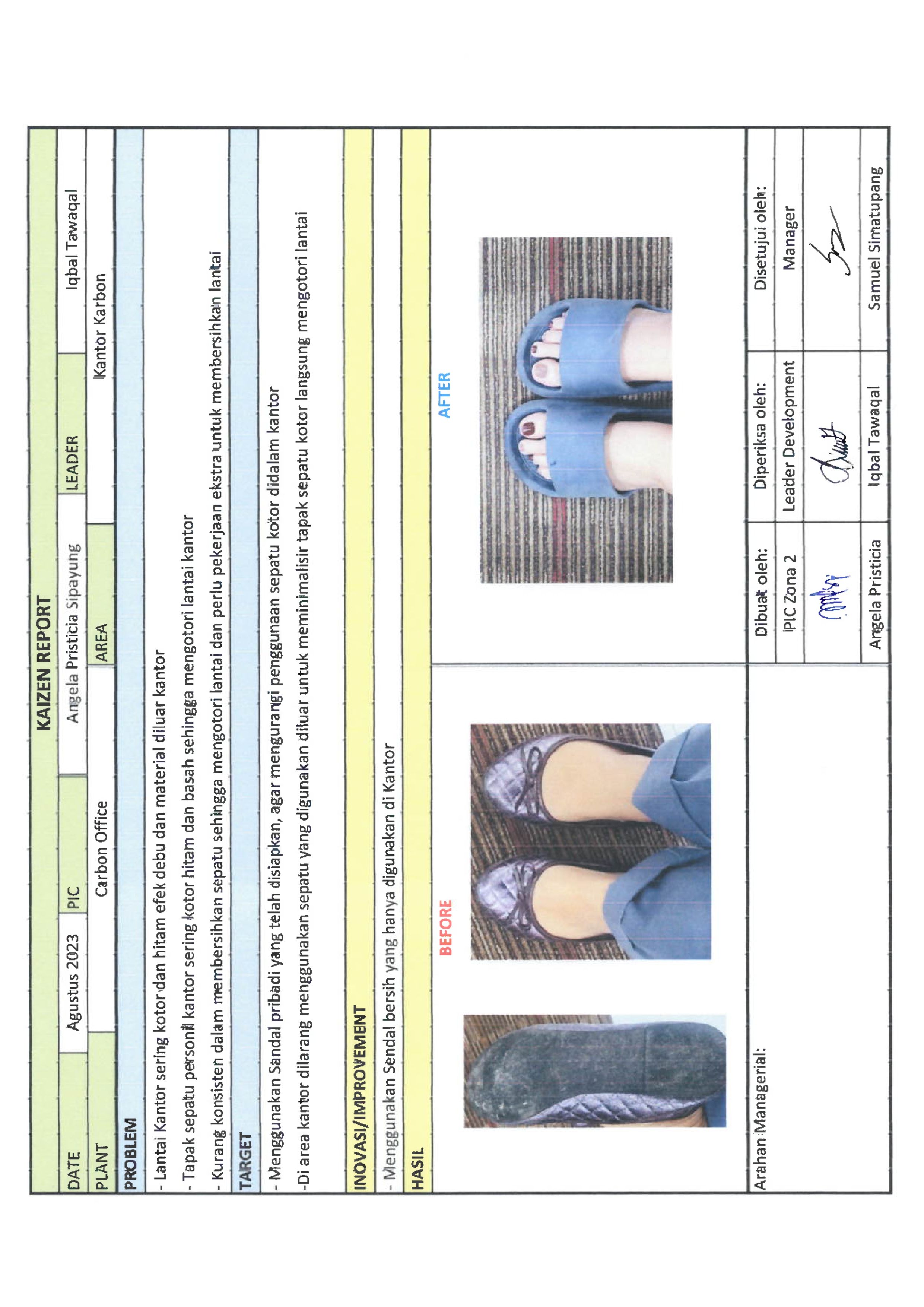 Menggunakan sendal bersih yang hanya digunakan di Kantor |